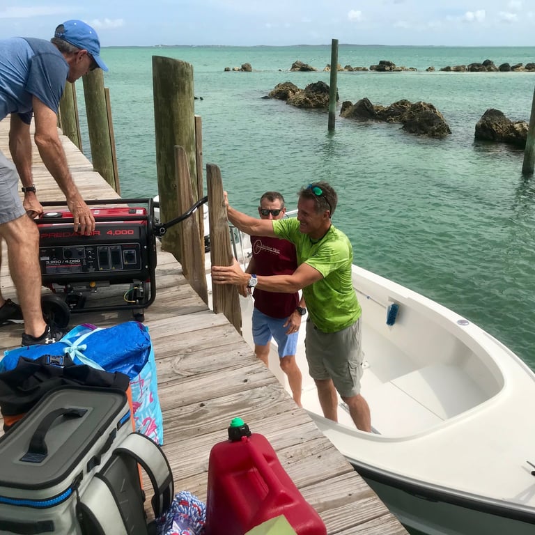 Back at the airport, we abandoned the Mercedes for a pick-up truck that we filled with a generator, endless tarps and roofing supplies, mold spray, tools, fans, drinking water, and a lot of tuna packs. The truck drove us to a recently repaired dock where we simply waited, again, not really knowing what the plan was. We were flying by the seat of our pants.