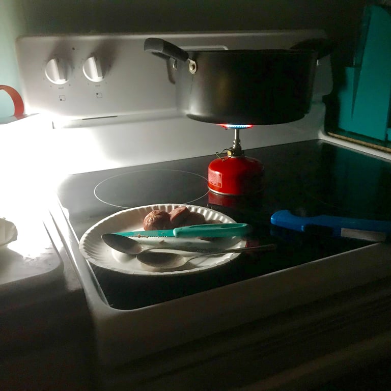 About 15 minutes after dark, what remained downstairs was dry and clean. Using an inflatable solar lamp any my tiny backcountry camping stove, I made us a quick dinner using summer sausage, a pouch of pre-cooked rice, a plastic container of corn, and a pouch of black beans. That night, it tasted like filet mignon. We drank some delicious warm bottled water with it and followed that with a lovely bath taken by sitting in the (now clean) bathtub with 1 gallon of cold cistern water each, water that we had to get by dipping a gallon jug down into the cistern.